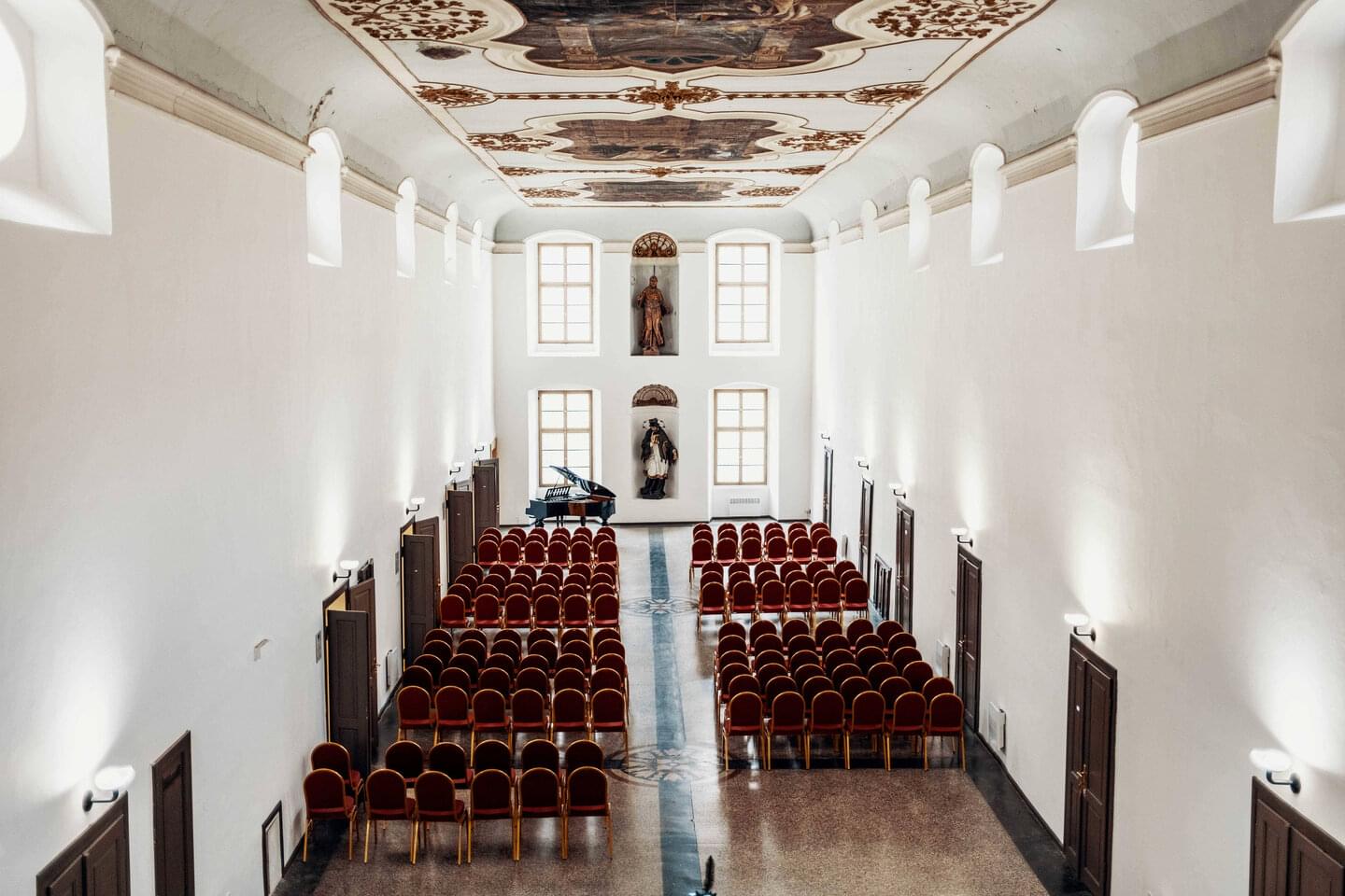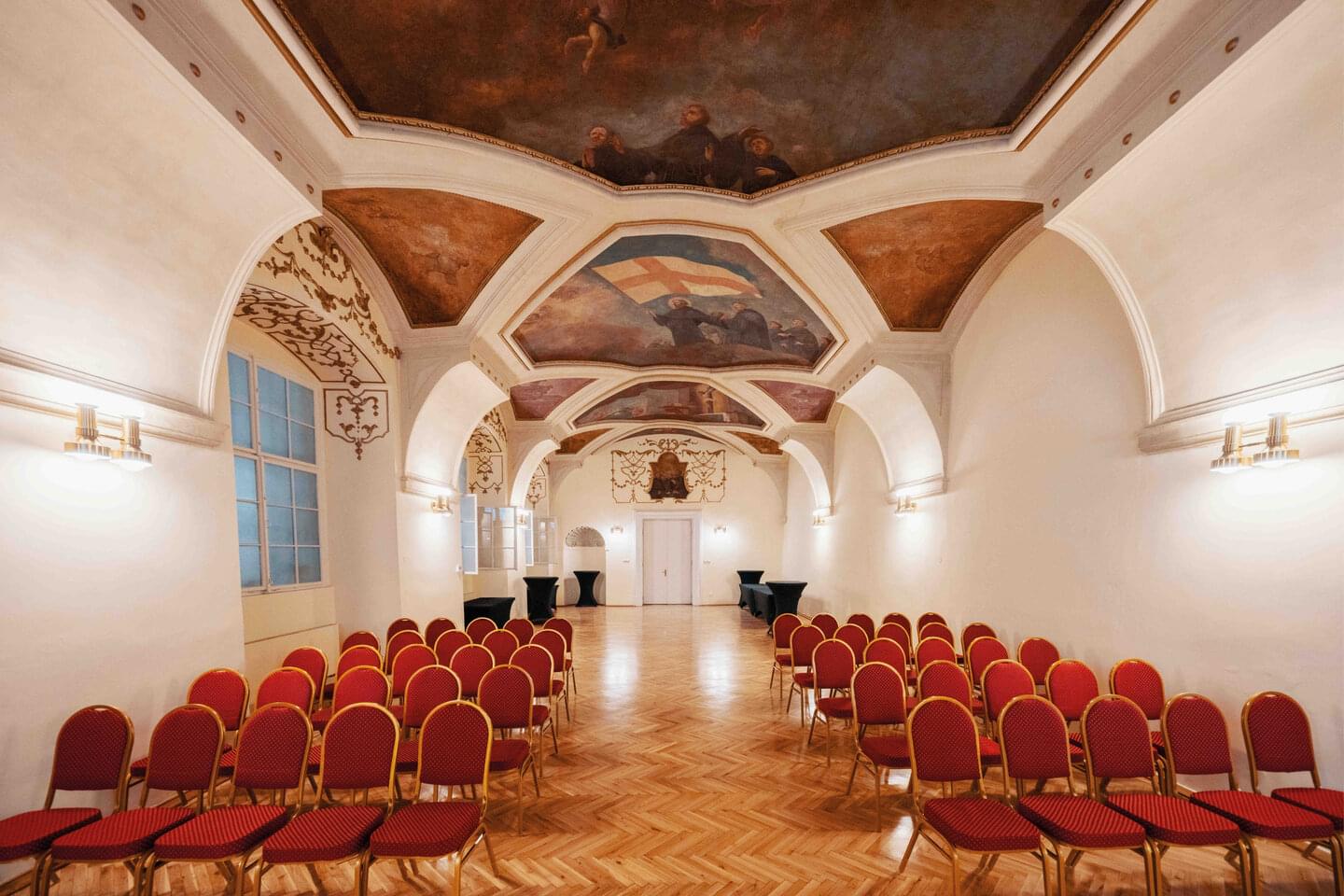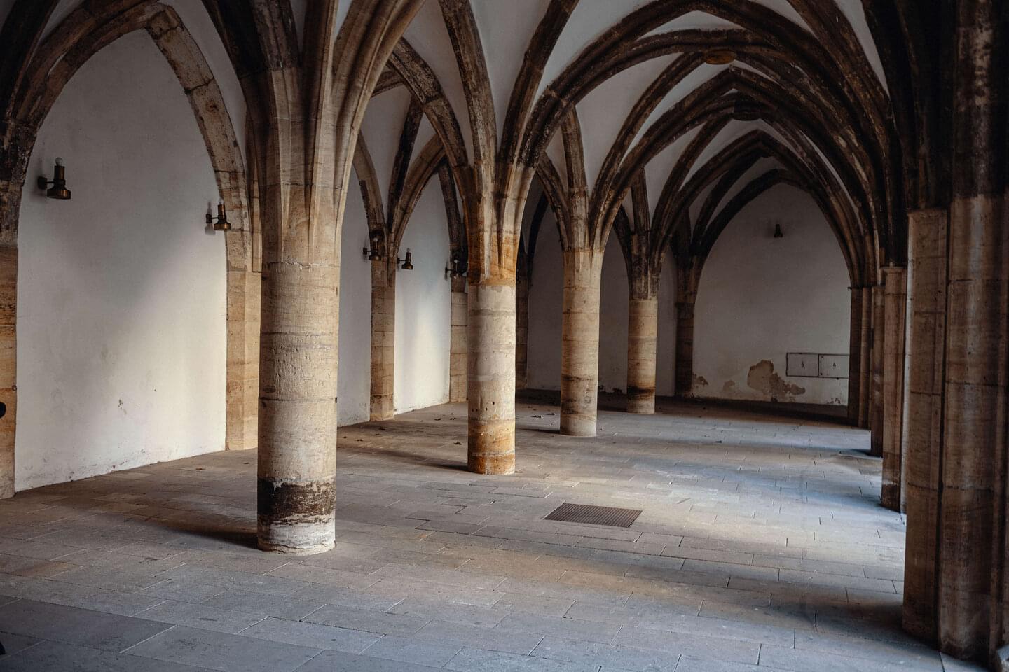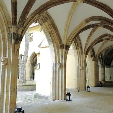 Z rozsáhlého komplexu se tak dodnes dochovala pouze část tvořená budovami kolem obdélného dvora. Část dvorních fasád tvoří gotické arkády a barokní arkády s půlkruhovými oblouky. Podstatná část interiérů si zachovala gotickou křížovou žebrovou klenbu, místy podepřenou středním sloupkem, zatímco většina prostor je klenuta barokními klenbami. Návštěvníci zde mohou spatřit také fresky inspirované životem sv. Františka z Assisi z 30. let 18. století od Františka Vogety, gotické i barokní arkády, žebrové klenby a zajímavé prostory, jako jsou Sál Jana Lucemburského nebo rajská zahrada.